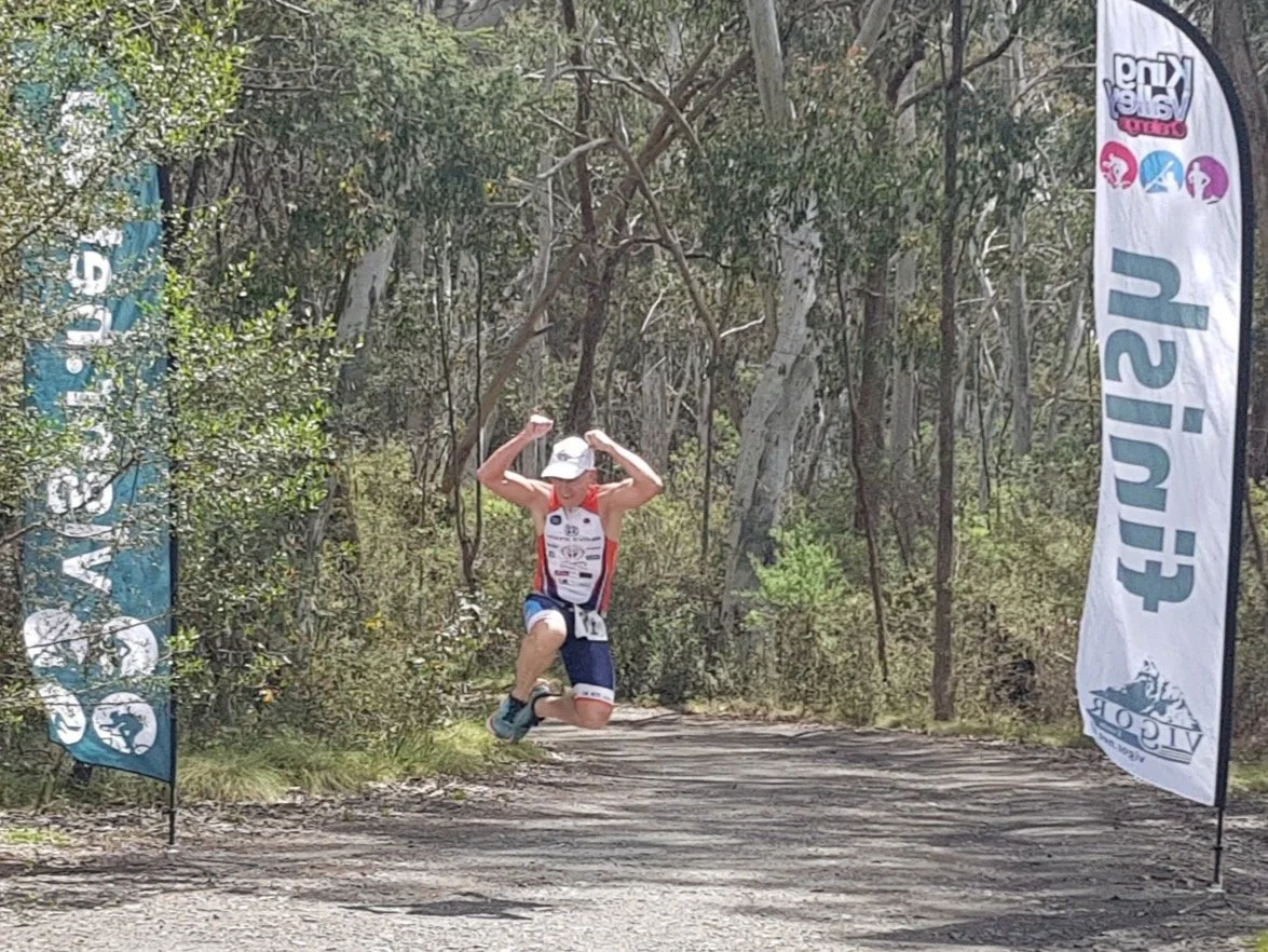 2 x Olympian Vic Mitchell crosses the line at Powers Lookout.